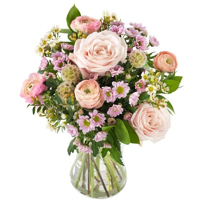Einer unserer Bestseller der Saison ist dieser Blumenstrauß in zarten Pastelltönen mit Rosen und Ranunkeln. Ein wahrer Blumentraum, der garantiert ein Lächeln auf das Gesicht des Empfängers zaubern wird. **Die Vase ist nicht inklusive**.