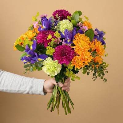 Wie ein Wirbelwind! Ein Blumenstrauß in kräftigen Farben der Energie und Lebensfreude ausstrahlt. Blaue Iris werden in diesem Blumenstrauß besonders schön mit Chrysanthemen und Dianthus kombiniert. Wen überraschst du als nächstes?