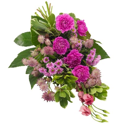 Ein einzigartiger Trauerstrauß mit einer verspielten Mischung aus Nelken, Santini, Eustoma und Astrantia in auffälligen Fuchsia-Farbtönen vor einem üppig grünen Hintergrund. Teile deine Trauer aus der Ferne mit einem schönen pinkfarbenen Trauerstrauß, der ein rührender Ausdruck von herzlicher Anteilnahme und Unterstützung in Zeiten des Verlustes ist. Schön und dennoch erschwinglich, ist dieser Trauerstrauß einer unserer günstigsten Trauerkompositionen.