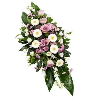 Zeige deine Zuneigung mit diesem liebevollen Trauergesteck in Lila und Weiß. Ein wunderschönes, doppelendiges Gesteck, geschmückt mit einer bezaubernden Mischung aus Rosen, Chrysanthemen, Gerbera und Eustomen in Rosa-, Flieder- und Weißtönen. Diese Sargauflage bietet ein außergewöhnliches Preis-Leistungs-Verhältnis und ist eine bedeutungsvolle, aber dennoch erschwingliche Möglichkeit, Beileid auszudrücken. Dieses wunderschöne Arrangement ist eine rührende Geste, die Trost in einer schwierigen Zeit spendet und sicherstellt, dass deine Gefühle mit Anmut und Aufrichtigkeit übermittelt werden.